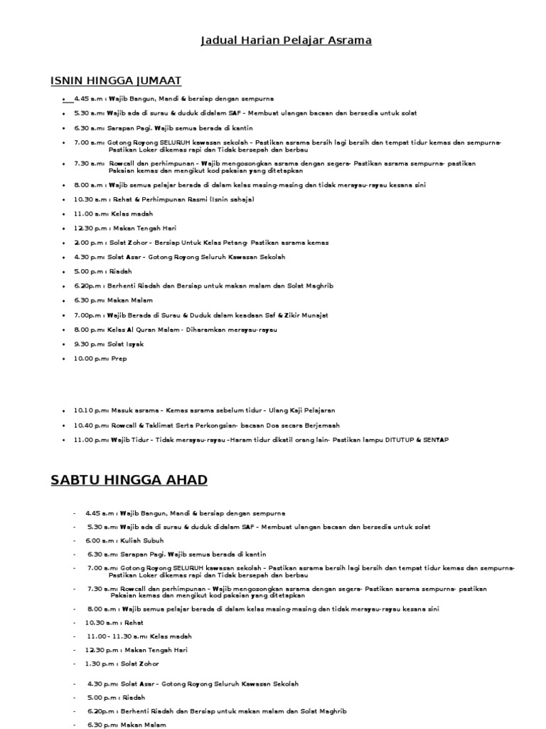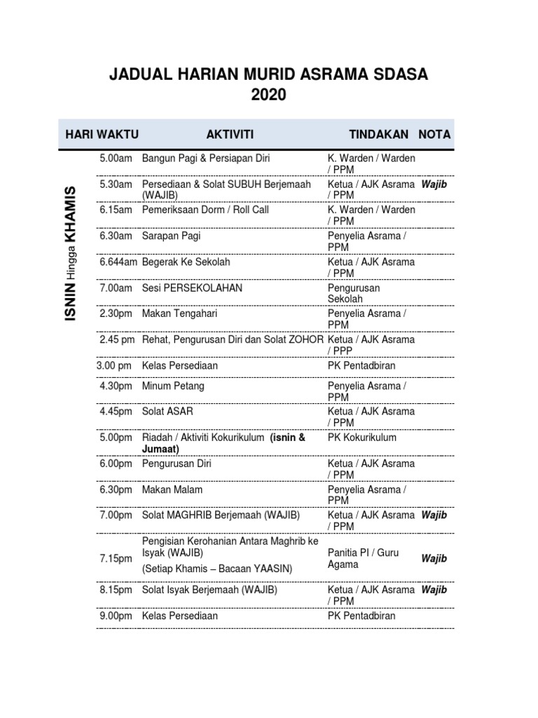 JADUAL HARI ISNIN HINGGA KHAMIS 0530 am Bangun pagi menguruskan diri mengemas dorm. Jadual Balik Bermalam. May 31 2020 1.